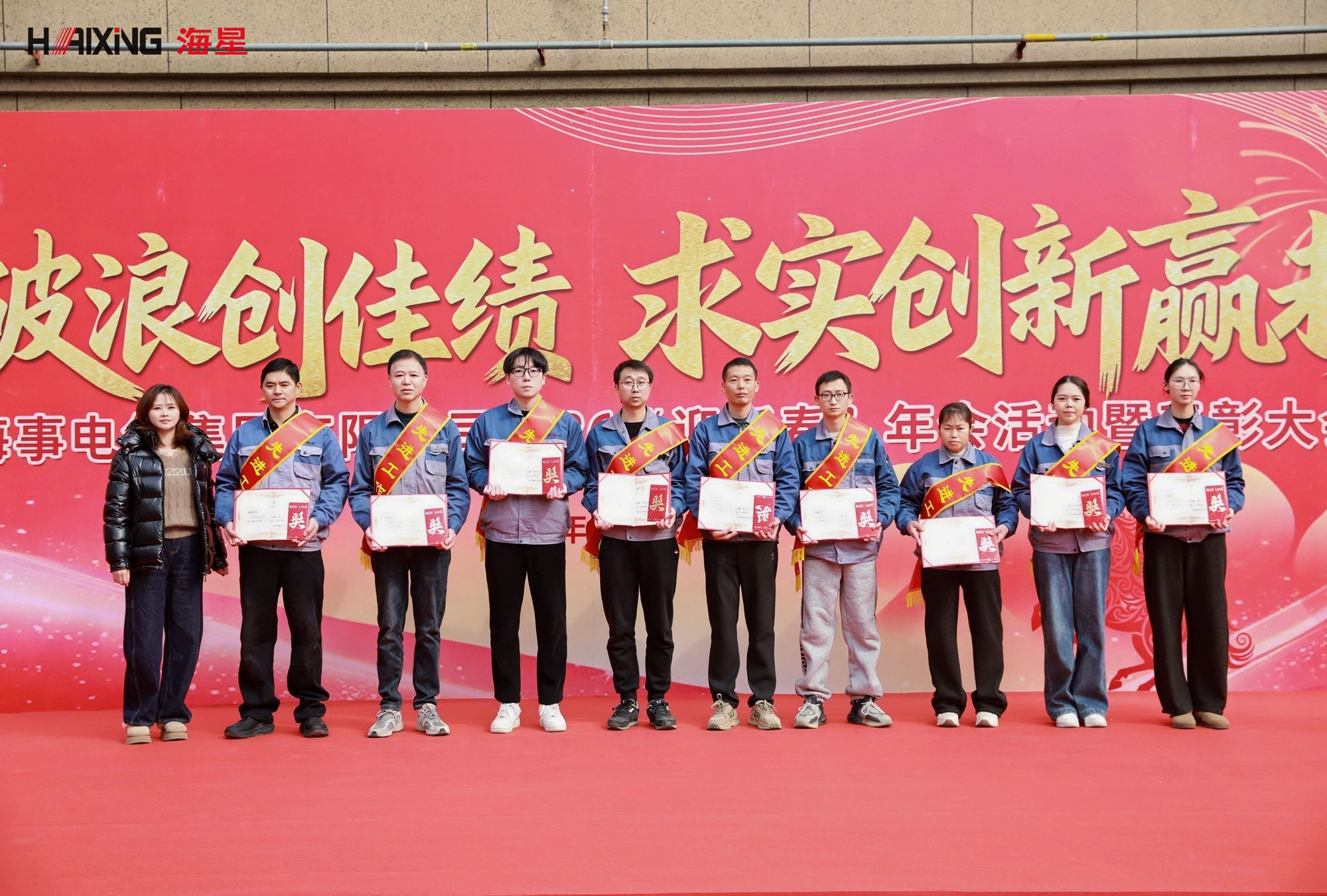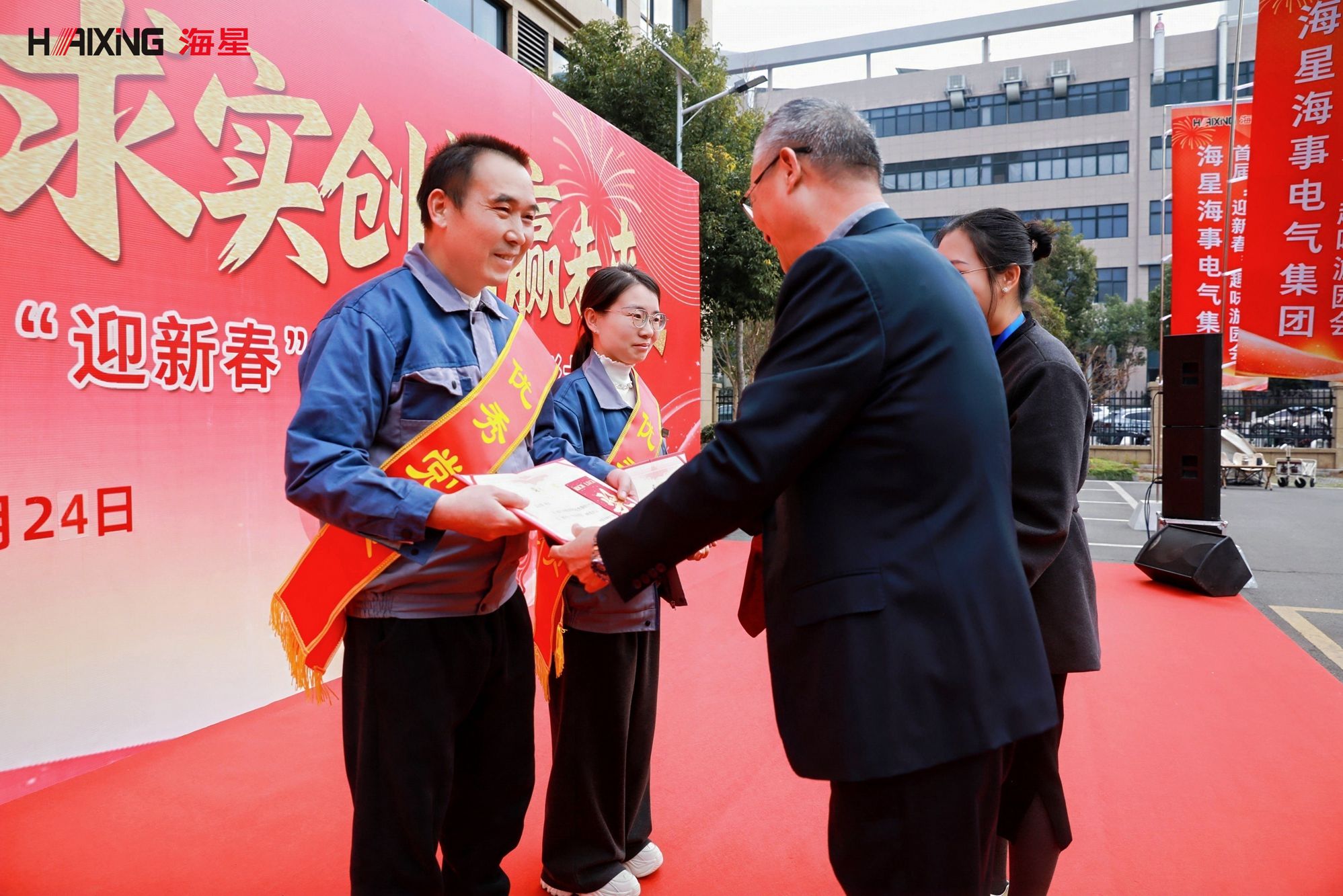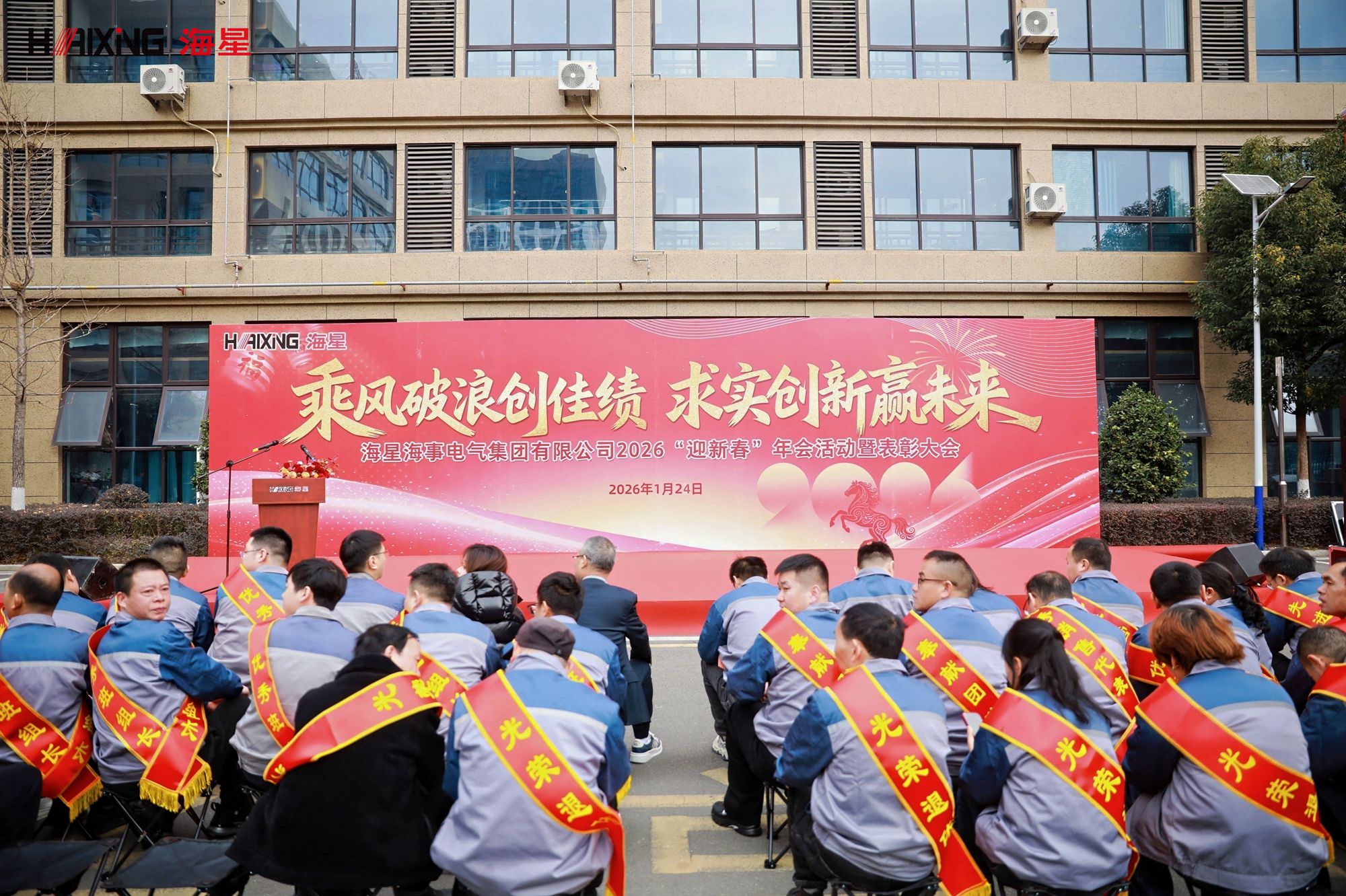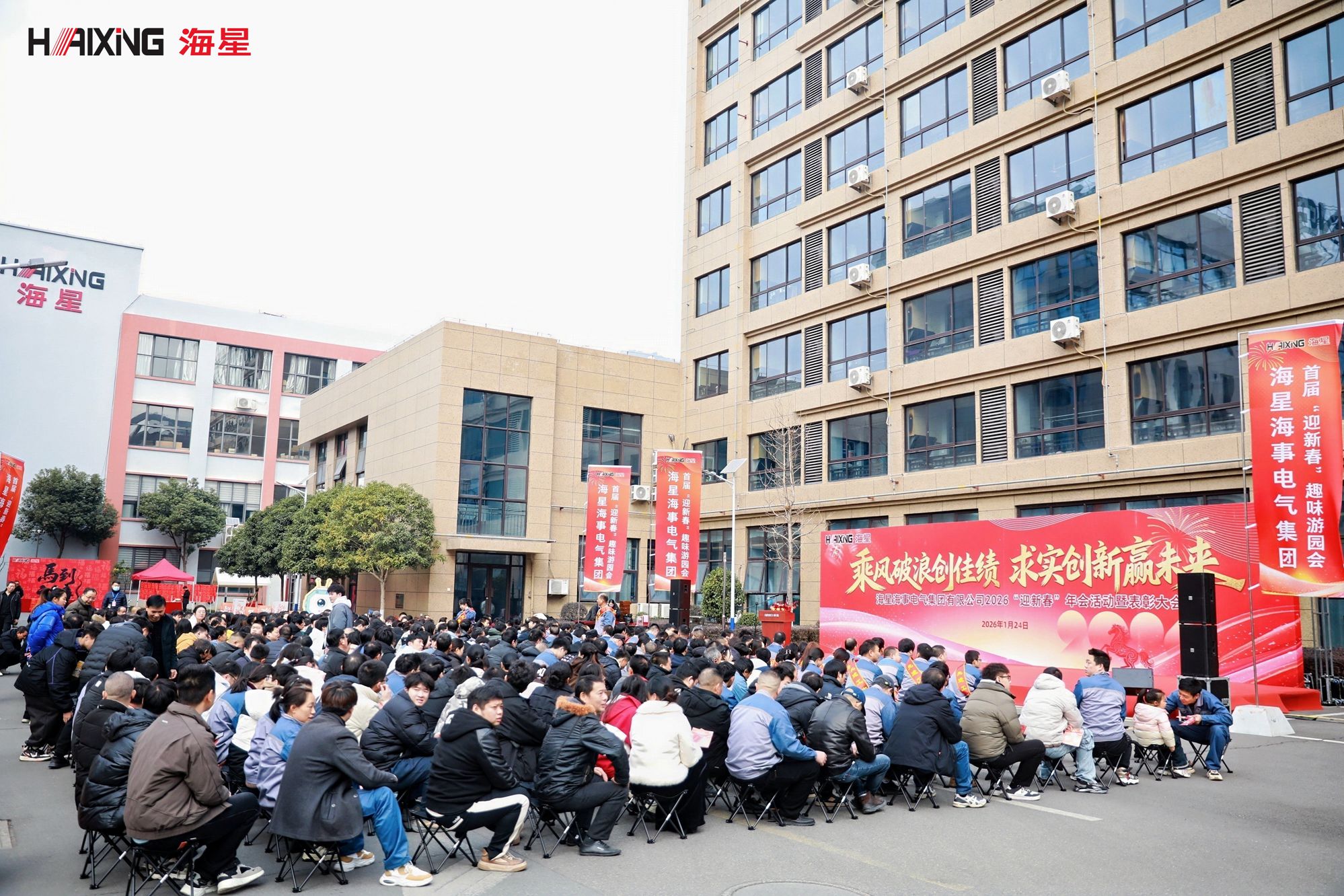 岁末年初,辞旧迎新。2026年1月24日,海星海事电气集团2026“迎新春”年会活动暨表彰大会在公司厂区内隆重举行。本次活动以“乘风破浪创佳绩 求实创新赢未来”为主题,分为表彰大会与趣味游园会两大环节,旨在表彰先进、凝聚人心、共迎新春。