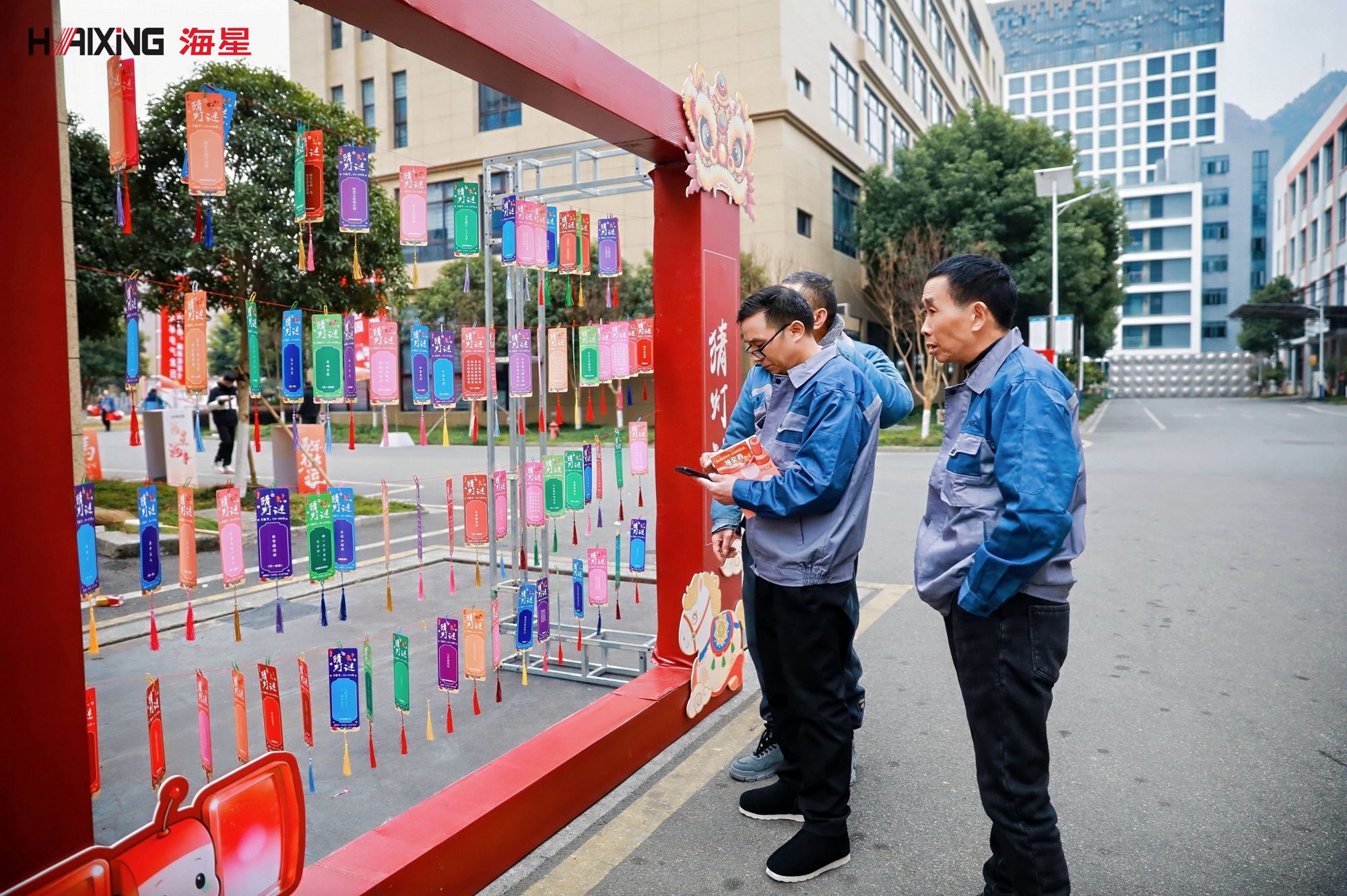 猜灯谜:一排排灯谜卡下,聚集了不少“智囊团”。有人低头沉思,有人热烈讨论,恍然大悟后地欢笑与领取奖品时地满足笑容,构成了温馨的画面。