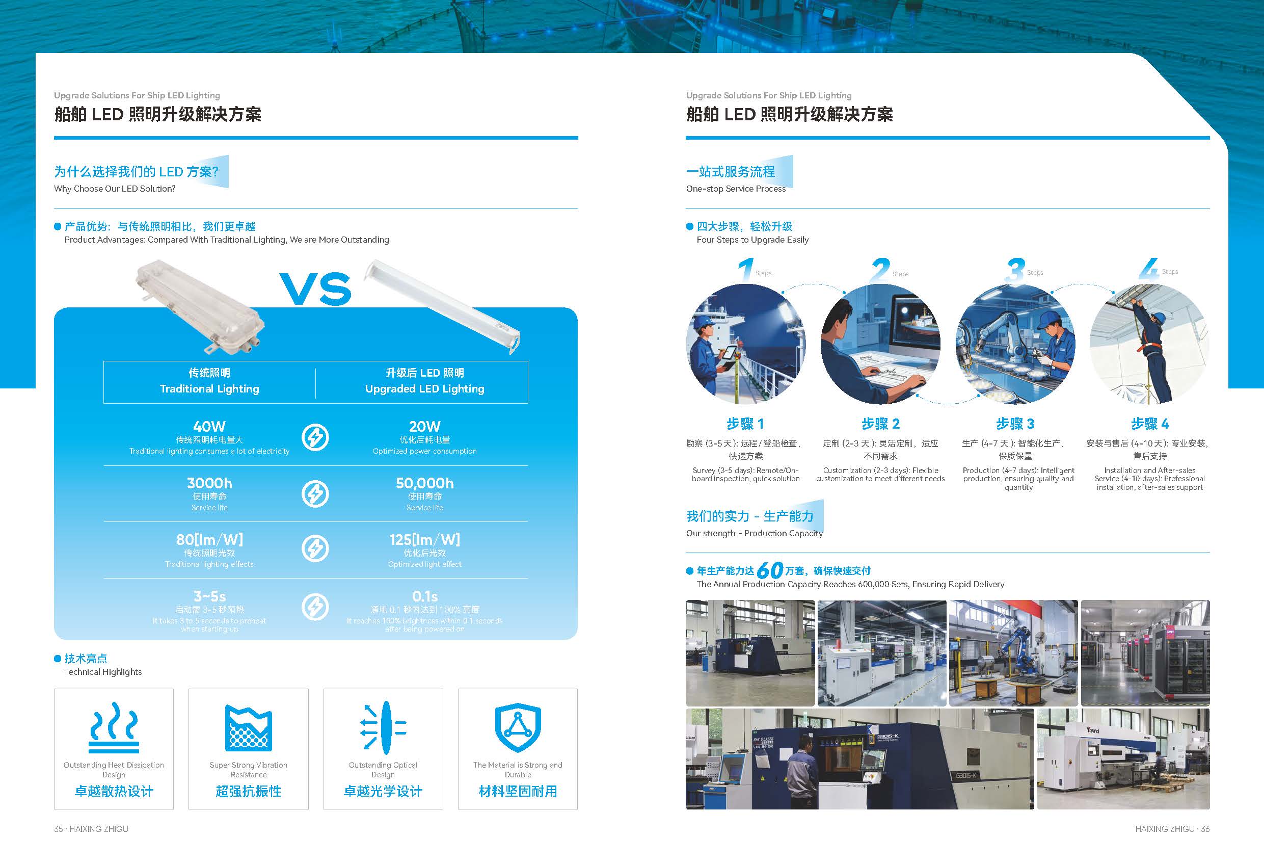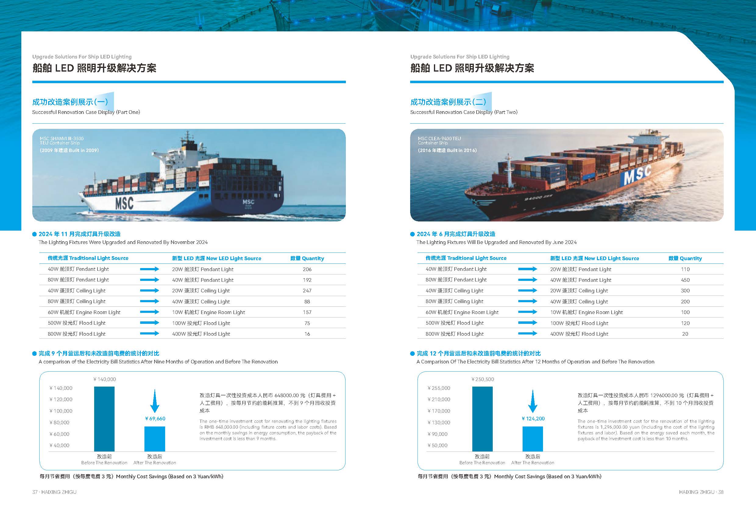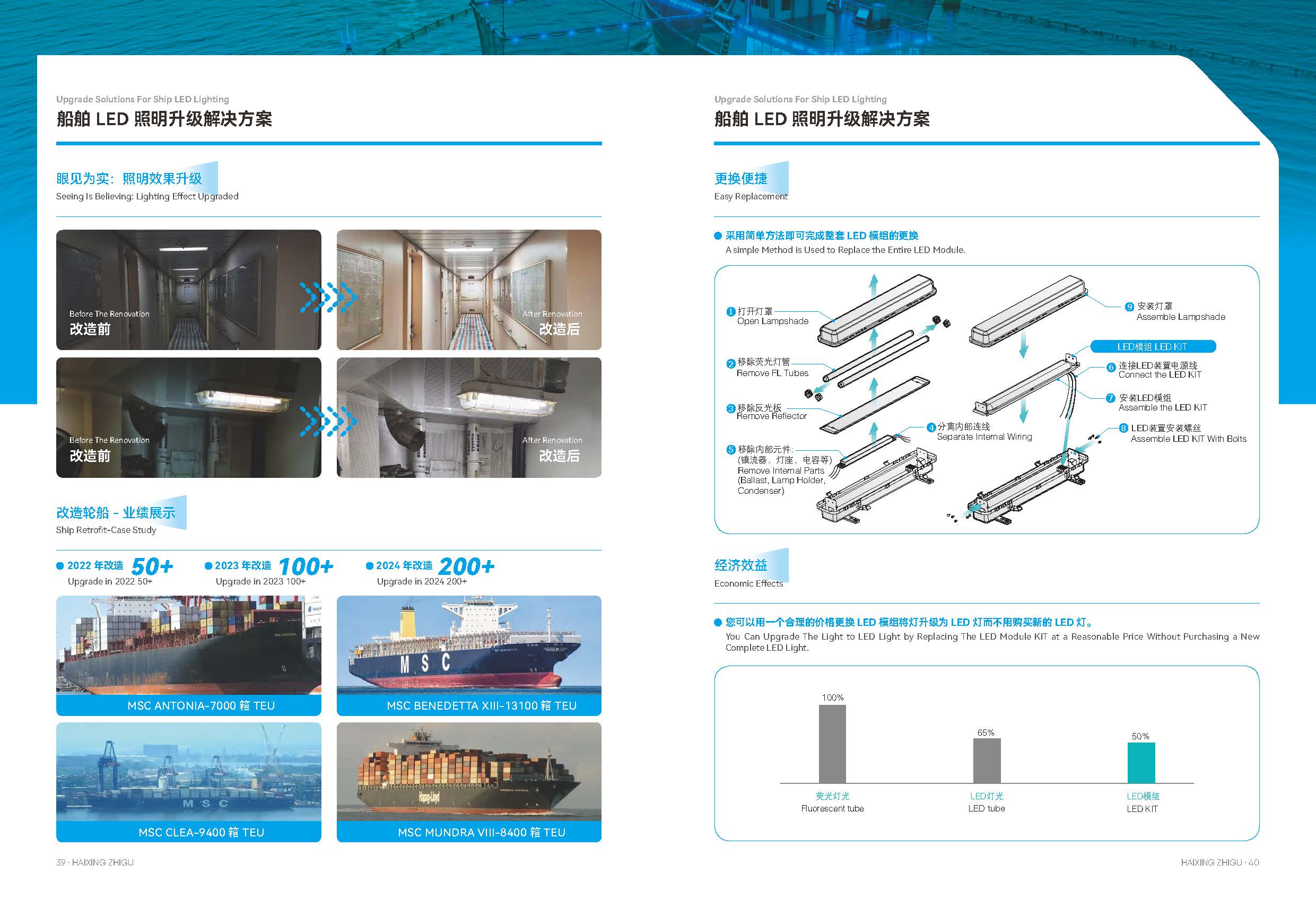 海星船舶 LED 照明升级解决方案应需而生,以节能 45%-67%、光效提升 47%-135%、5 万小时长效耐用的核心优势,搭配抗振耐腐蚀、0.1 秒满亮的卓越性能,一站式覆盖勘察、定制、生产、安装售后全流程。众多 MSC 系列船舶改造案例见证,短至 9-10 个月即可回收投资,让船舶照明焕新升级,为航行注入节能、经济、安全的强劲动力!