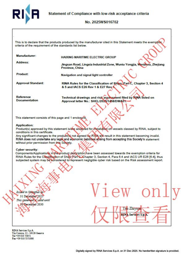 意大利船级社(RINA)作为国际船级社协会(IACS)核心成员,其发布的《船载计算机系统网络安全认证》,是基于UR E26《船舶网络韧性》,E 27《船载系统和设备网络韧性》国际统一要求和意大利《RINA船舶分类规则》构建的权威评估体系,获得这一项网络安全认证,意味着海星集团的航行灯控制器、信号灯控制器产品在专业性、安全性和可靠性等方面都达到了国际先进水平。
